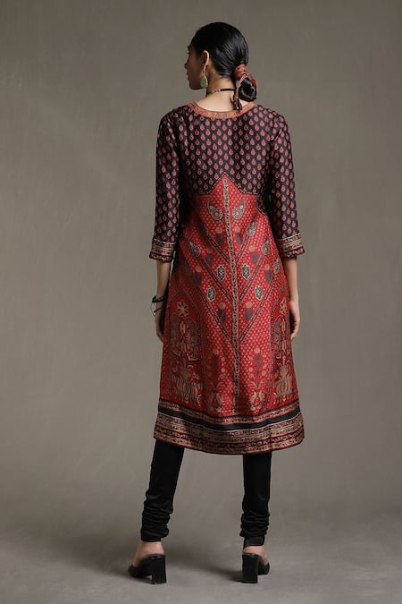Red silk kurta featuring Sanganeri prints and light kashida embroidery. Paired with a churidar and a printed dupatta.