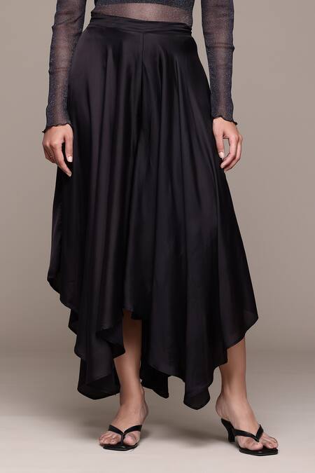 Black dhoti style draped pant featuring an asymmetric and flared hem cut