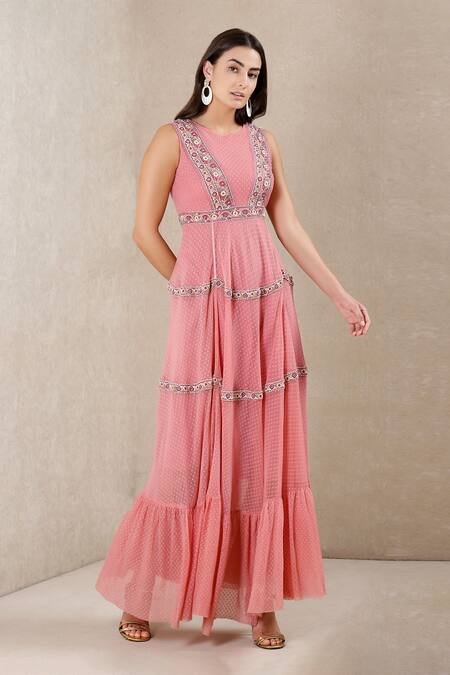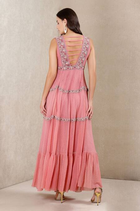 Ritu Kumar_Pink Dot Net Round Tiered Dress_Online_at_Aza_Fashions