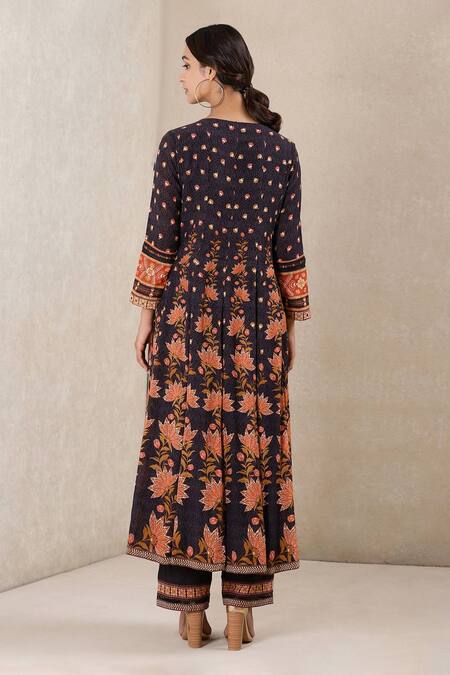 Black anarkali featuring all-over contrast floral motif prints. Paired with a pant & dupatta.