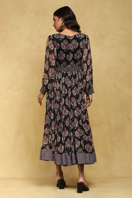 Black Viscose, Chiffon Round Neck Zohra Botanic Print Long Dress