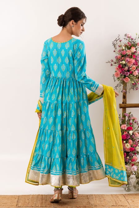 Firozi blue long sleeves tiered cotton anarkali featuring an all-over bloom crest motif handblock print with mirror highlights and gota lace embellishments. Paired with a lime green printed border gota lace embellished kota doria dupatta and a legging.