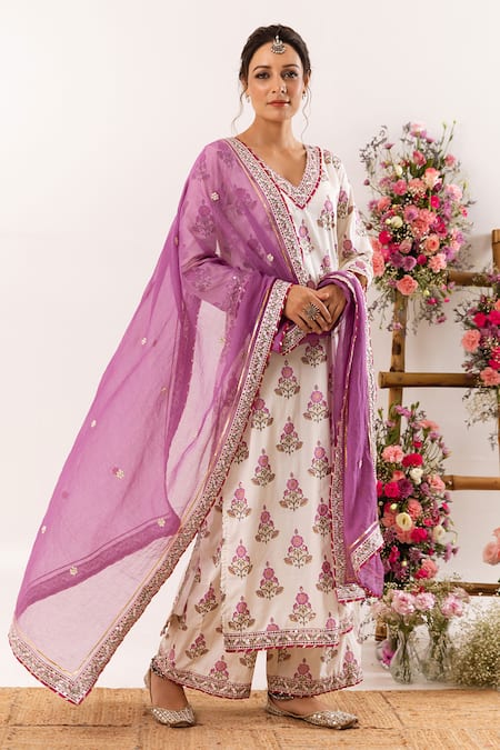 Purple straight kurta featuring three fourth sleeves and V neck with all over peony handblock print. Paired with matching palazzo pant and kota doria dupatta embellished with pearl and zari floral handwork detailing.