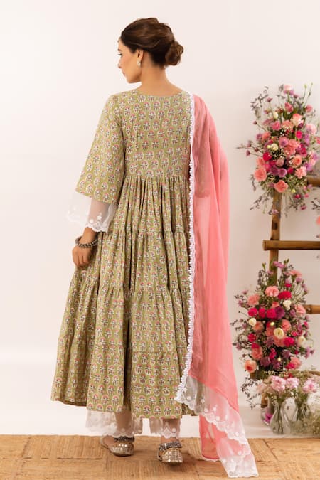 Green Cotton, Kota Doria Lace V-neck Tribal Bloom Handblock Print Anarkali Set