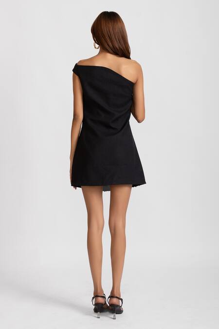 Black mini dress featuring a one-shoulder neckline and sleeveless design