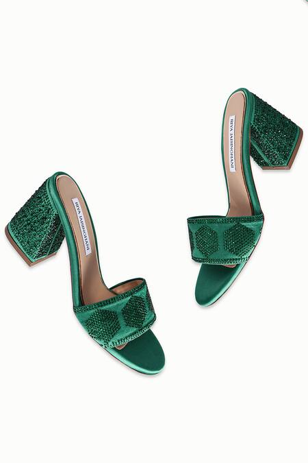 Emerald green block heels featuring two straps with all over crystal embellishments