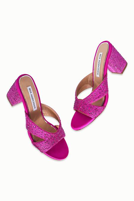 Pink criss cross strap block heels featuring all over crystal embellishments