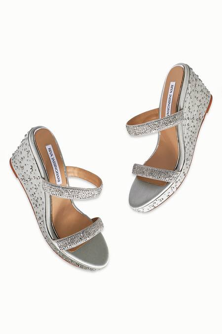 Silver wedges featuring almond toe front with two straps and all-over crystal embellishments
