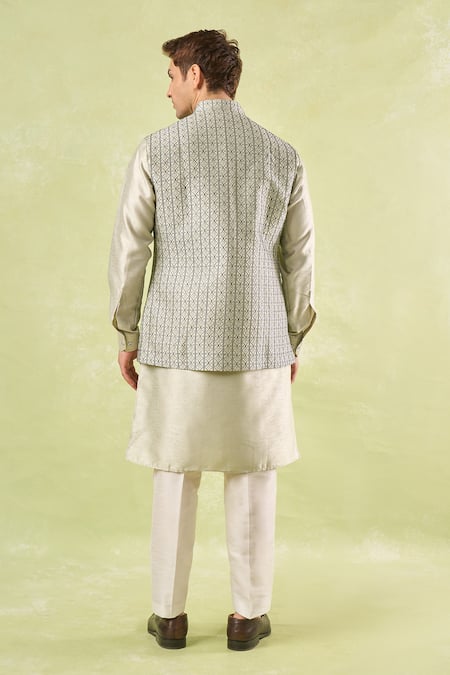 Beige raw silk jacket featuring thread embroidery. Paired with an off white dupion silk kurta and off white dupion silk pants.