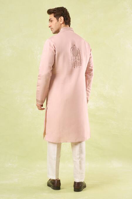 Blush pink kurta featuring resham embroidery and a mandarin collar. Paired with off white dupion silk pants.