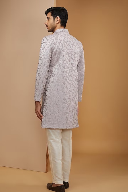 Purple achkan featuring full sleeves, mandarin collar, and intricate thread and zari embroidery in a floral pattern. Paired with off-white Mexican pant, this set is crafted from dupion silk and lined with shantoon.