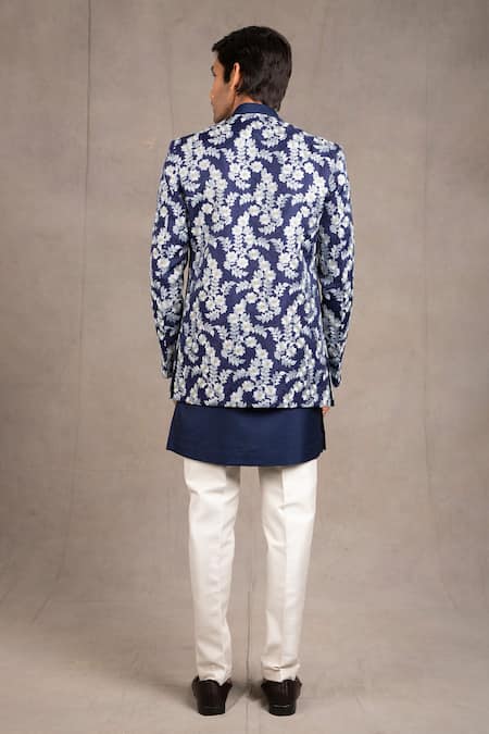 Midnight blue raw silk short open jacket enhanced with light blue resham & sequin floral embroidery. Paired with a blue short dupion silk kurta enhanced with gold show buttons & an ivory dupion silk mexican pant.