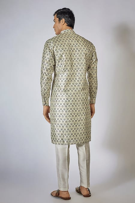 Sage green kurta featuring a floral print, mandarin collar, and full sleeves. Paired with off-white pants for a complete look.