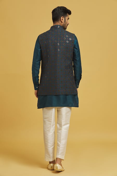 Cobalt blue raw silk bundi jacket featuring geometric thread and sequin embroidery. Paired with a matching dupion silk kurta and off white dupion silk Mexican pant.