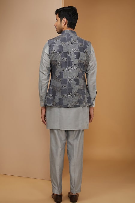 Royal blue bundi featuring thread and sequin embroidery in geometric patterns. Paired with a full sleeve cotton silk kurta and grey Mexican pant.