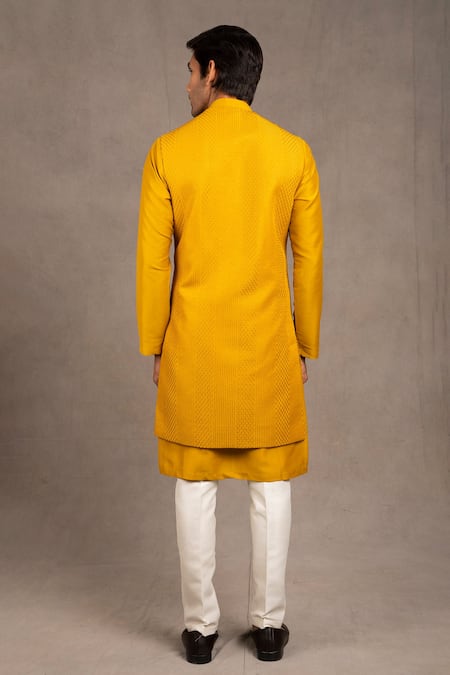 Yellow geometric embroidered bundi featuring sleeveless design and open neckline. Paired with a high collar cotton silk kurta and white dupion silk pant.
