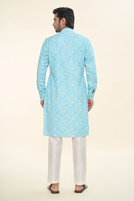 Blue ikat printed kurta featuring placement sequins embroidery and a mandarin neckline. Paired with off white cotton silk pants.
