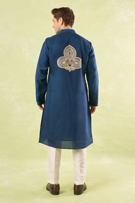 Navy blue kurta made from cotton silk featuring intricate resham embroidery. Paired with off-white dupion silk pants for a complete look.