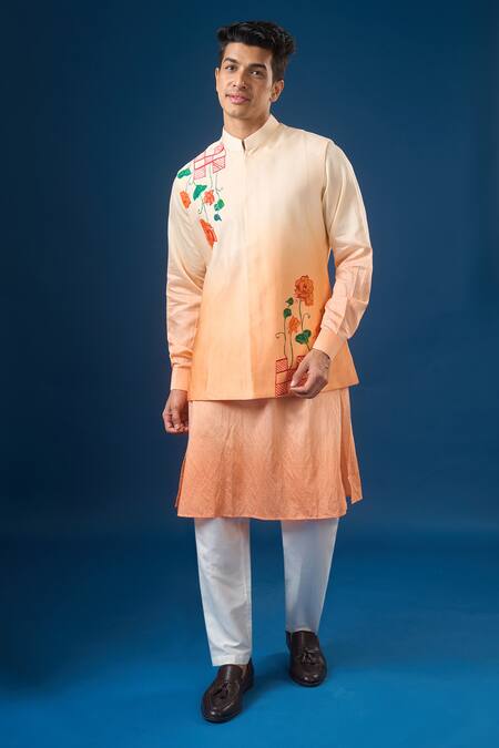 Peach ombre bundi featuring resham work and a mandarin collar. Paired with a matching kurta and pant in cotton silk.