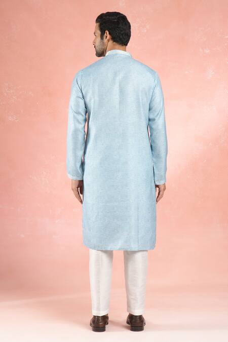 Light blue kurta featuring full sleeves, band collar, and resham thread & mirror embroidered placket. Paired with off white dupion silk base pant.
