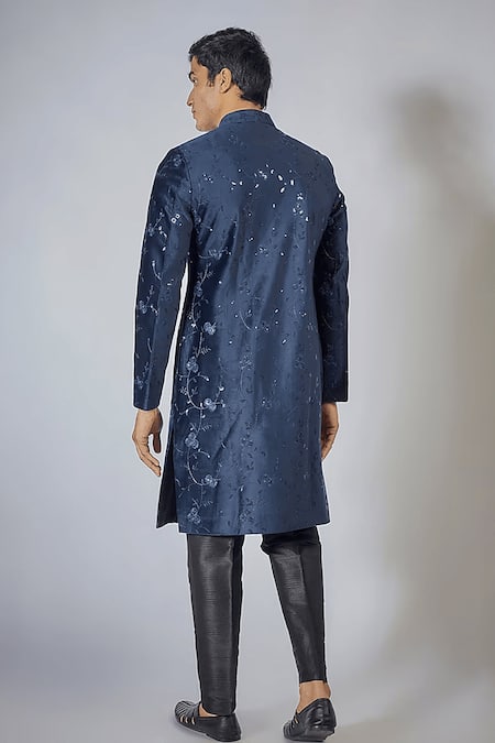 Royal blue full sleeve achkan featuring sequin embroidery in a floral pattern and a mandarin collared neckline. Paired with black mexican pant.