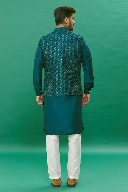 Teal blue raw silk bundi jacket featuring thread and sequin embroidery. Paired with a teal blue dupion silk kurta and off white dupion silk pant.