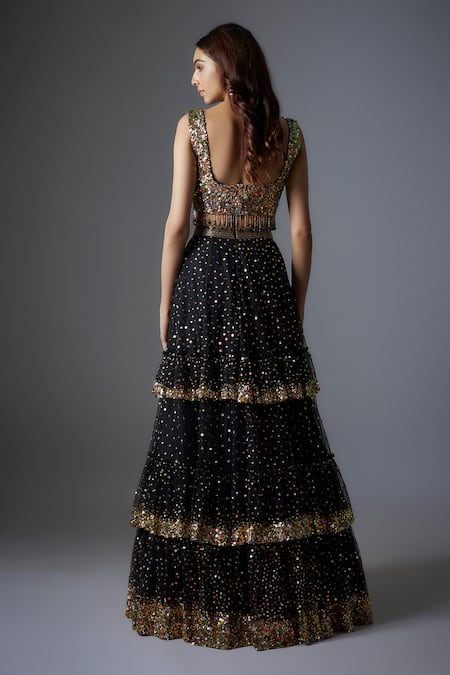 Black net lehenga featuring sequins embroidered tiered panels and an attached metal buckle belt. Paired with a coordinating crystal tassel embroidered padded blouse.