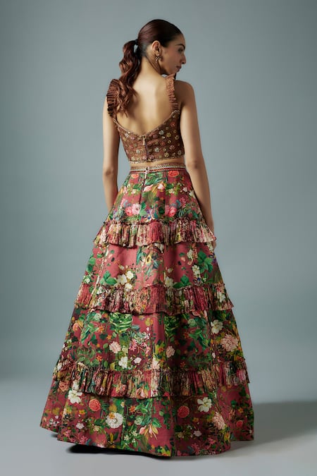 Maroon frilly tiered lehenga featuring all-over bloom print and signature buckle belt detailing. Paired with a padded brocade blouse with strap sleeves and embroidered highlights.