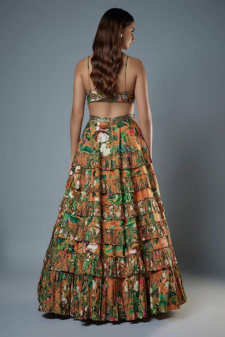Multicolour tiered ruffle lehenga featuring multicolour botanical print & attached embellished belt with R-logo on buckle. Comes with bead patchwork embellished padded blouse.