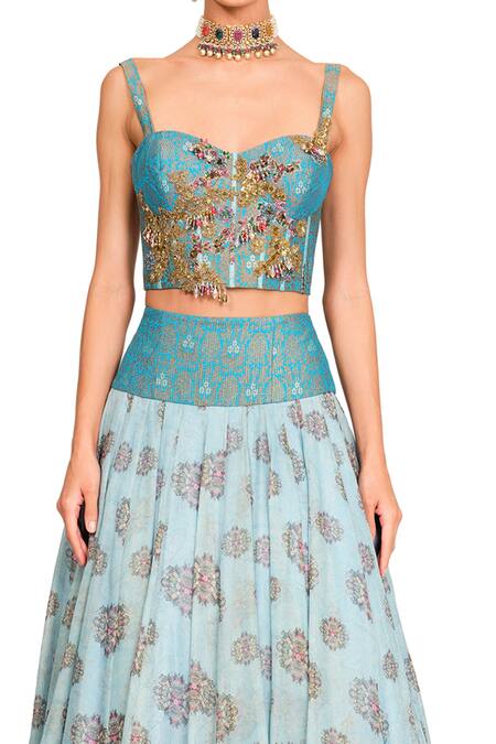 Blue brocade corset top with embroidery and tassel detailing. Comes with organza skirt with brocade belt.