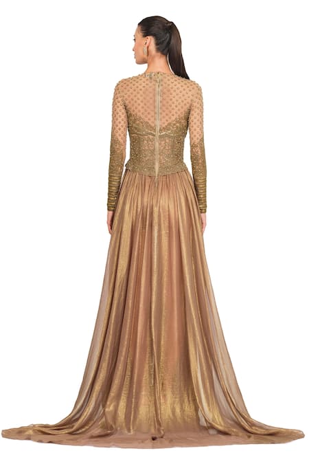 Copper gown with hand embroidery on full sleeves & bodice.