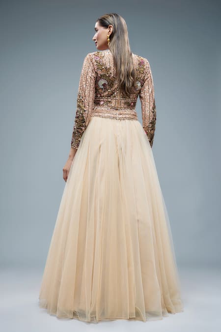 Beige padded blouse featuring all-over floral, sequins, and beads embroidery. Paired with an A-line lehenga adorned with a sequined waistbelt.