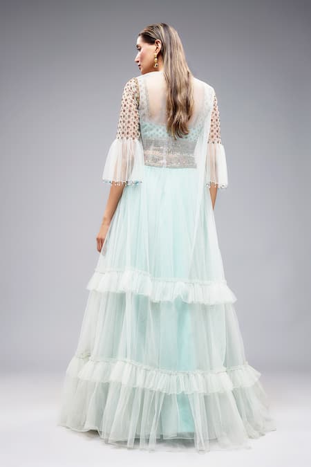 Sky blue lehenga set featuring a padded blouse with sequins and cutdana embroidery. Accompanied by a long frilled cape with sheer sleeves and a floral embroidered waistbelt.