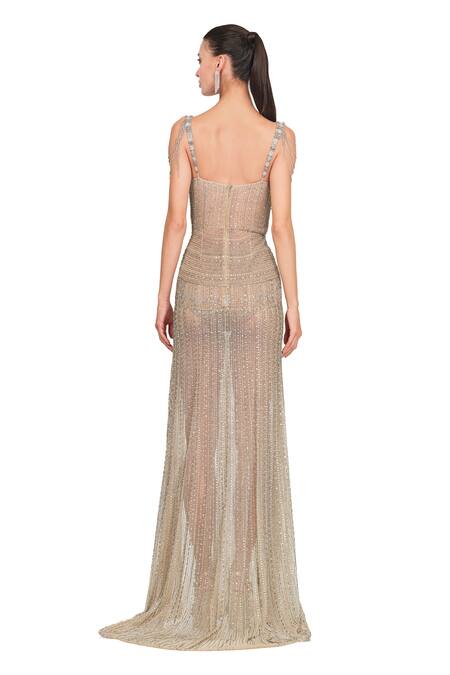Ivory gown with all-over crystal embellishments, embroidery on the shoulder straps, chain detailing in front and thigh high slit.