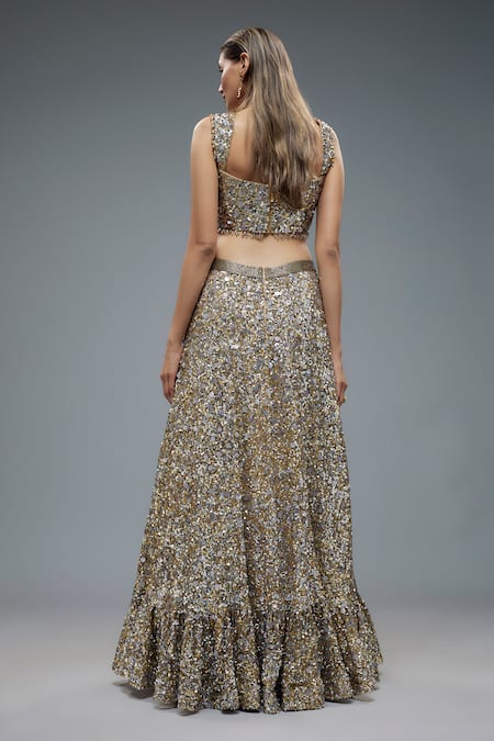 Multi color net A-line lehenga featuring sequins embroidery and a ruffled hem. Paired with a crystal tassel embroidered flared sleeve padded blouse.