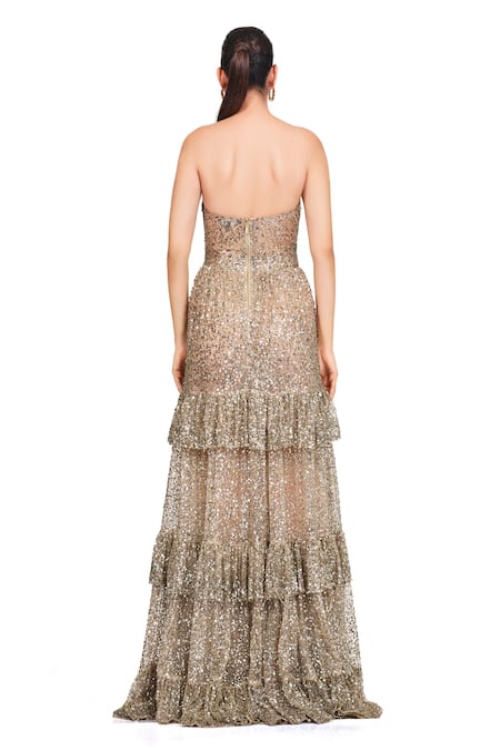 Silver tube hewn with all-over sequins embroidery with layered frills.