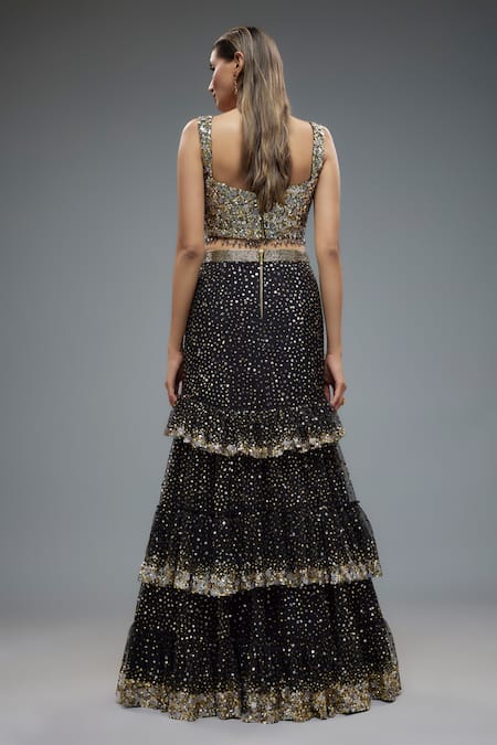 Black net mermaid lehenga featuring sequins embroidered tiered panels and an attached metal buckle belt. Paired with a crystal tassel embroidered padded blouse.