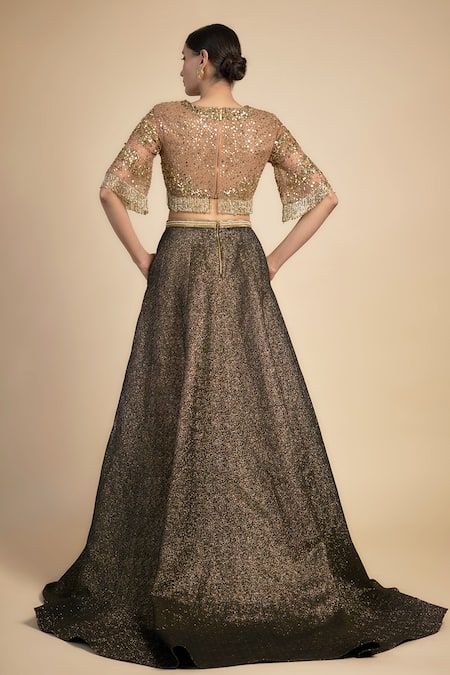 Gold padded sheer blouse featuring sequin and crystal embroidery with bell sleeves. Paired with a textured lehenga with a logo buckle belt and side pockets.