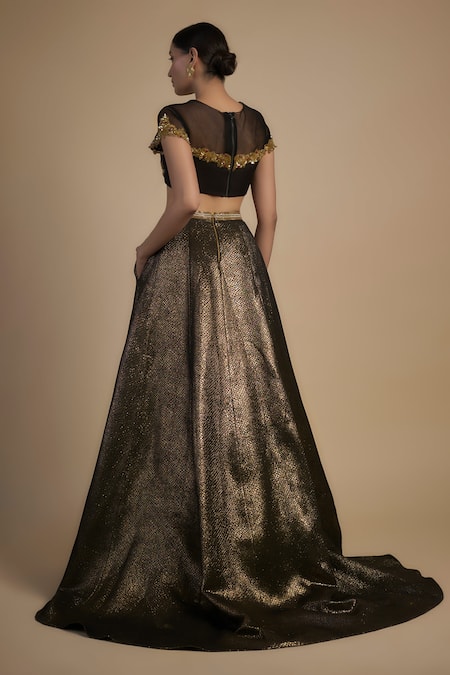 Gold and black blouse featuring tribal embroidery with sequins and dangling chain tassels. Paired with a textured lehenga that includes a logo buckle belt and side pockets.