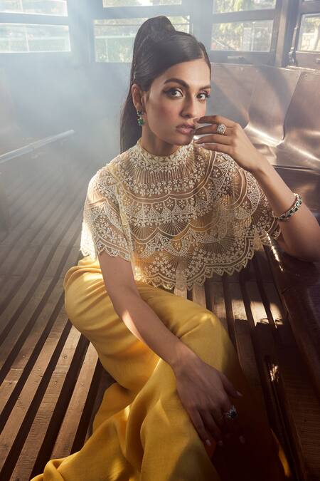 Yellow bustier featuring a V-neckline and sleeveless design. Paired with a scalloped cape and asymmetric draped skirt, embellished with pearl and sequin work.