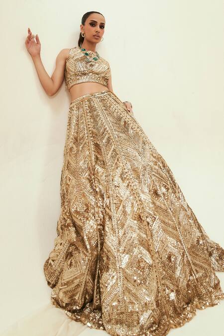 Gold Net Sequins, Cut Work Round Neck Amire Embroidered Lehenga Set