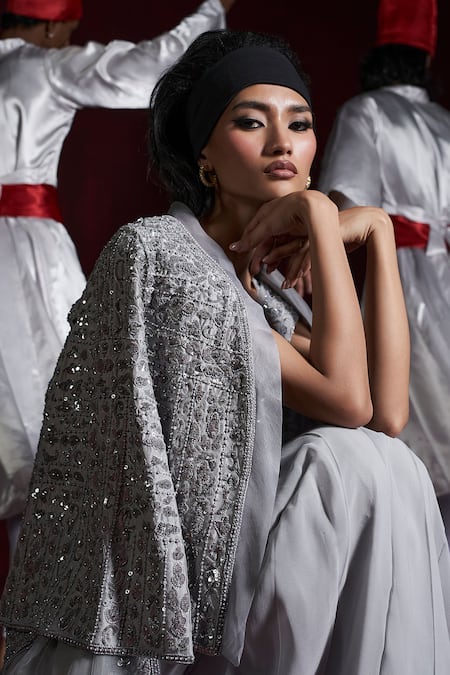 Grey pre-draped saree featuring sequins and cutdana embroidered border in strip pattern. Accompanied by an embroidered border cape and padded blouse.