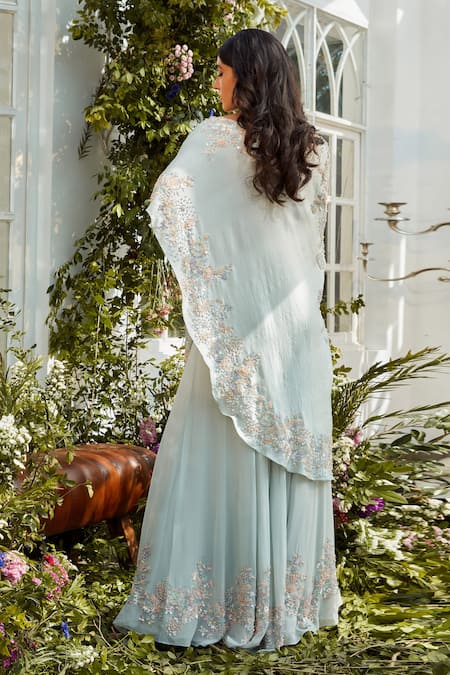 Mint green net off shoulder cape in embroidered sequins, bead and cutdana work. Paired with embroidered hem sharara.