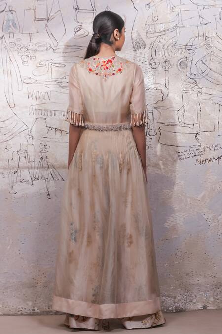 Beige organza hand-embroidered jacket featuring floral sequin work and a front tie detail. Paired with a matching inner top and double-pleated printed flared pant.