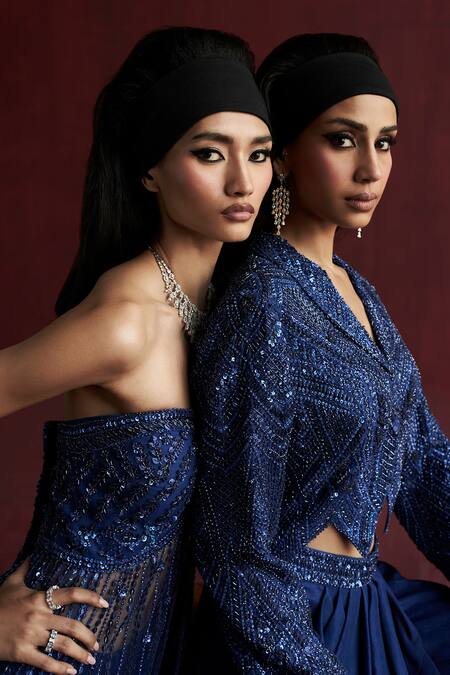 Electric blue jacket featuring sequins and cutdana embroidery in geometric pattern. Paired with an embroidered draped frill skirt.