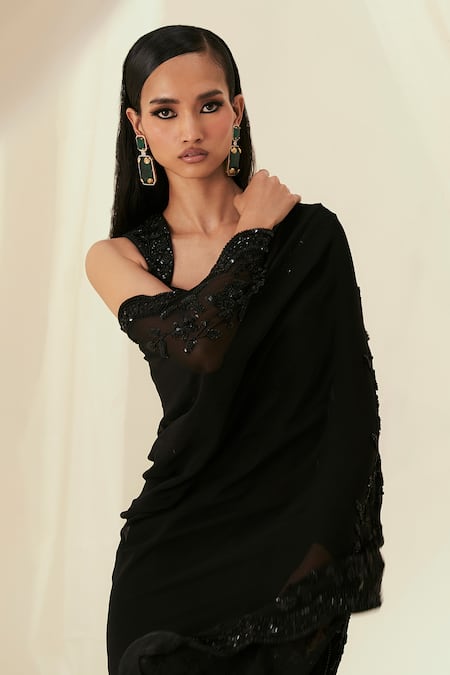 Black pre-draped saree featuring sequin and beads embroidery in floral bunch motifs with a scallop border. Paired with an embroidered padded blouse and cutout back design.