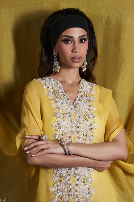 Yellow embroidered cape featuring pearls and beads with a floral pattern. Paired with a padded blouse and pleated frill draped skirt.