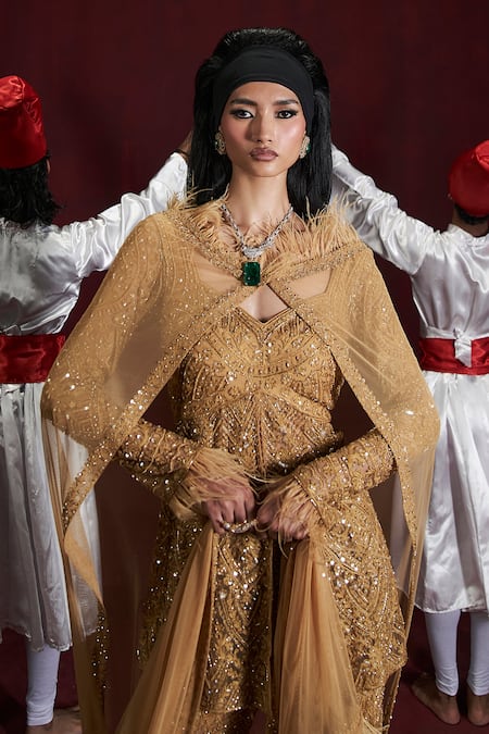 Gold peplum top featuring sweetheart neckline, full sleeves, and intricate cutdana and sequin embroidery in geometric patterns. Paired with a matching embroidered sharara and dupatta with feather border detail.