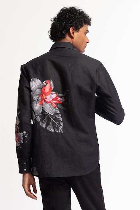 Floral embroidery on sleeves and back, Button-down front, Long sleeves