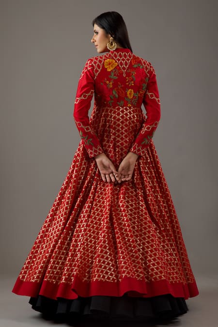 Red Silk, Cotton Embroidery Mandarin Carnation Bloom Banasai Jaal Anarkali Set